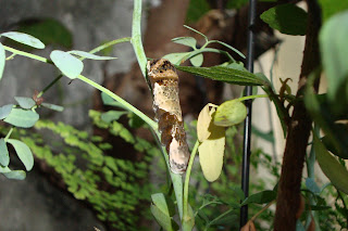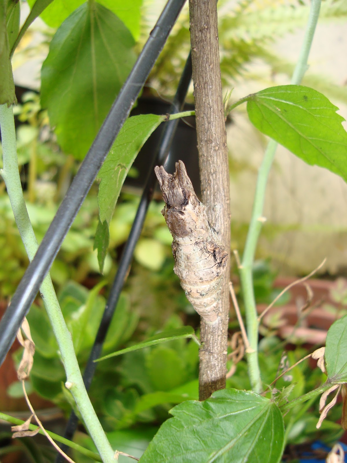 No dia 31/01, havia um casulo, e um problema! Perdemos três das quatro lagartas. A única que restou na arruda era justamente a que menos cresceu. Se logo ela, a menor das quatro, já havia feito um casulo, as lagartonas sem dúvida nenhuma já estavam dentro dos seus, só que o problema era saber onde. Veja abaixo como o casulo se camufla com o caule da arruda, parecendo ser uma de suas ramificações. Após várias tentativas (sem sucesso) de localizar os outros casulos, desistimos e resolvemos voltar toda a nossa atenção para a nossa lagartinha que agora estava dentro de seu casulo, se preparando para voltar ao mundo como uma bela borboleta.